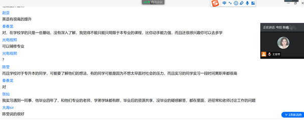 在“我为母校献一策”互动交流环节,毕业生党员谈到老员工活的收获与感慨,围绕学风建设、课程设置、校园环境、质量提升,社团发展、文化活动、双创教育、员工联系等方面畅所欲言,建言献策。逐个语音发言后,毕业生党员们意犹未尽,又转战到聊天区以文字形式围绕这些话题互动共鸣。