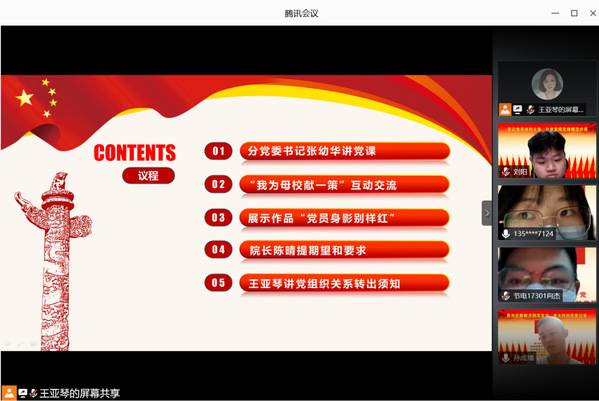 (通讯员 王亚琴)为庆祝中国共产党成立99周年,扎实推进“两学一做”学习教育常态化制度化,丰富毕业生离校教育形式,tyc539太阳集团于6月27日晚在腾讯会议平台开展了“迎七一,‘五个一’送别毕业生党员”活动。毕业生党员在校期间,最后上一节党课、献一个计策、听一声叮嘱、忆一次身影、领一份礼包。tyc539太阳集团分党委7名党委委员、2位员工支部书记及全体毕业生党员参加,本次活动由分党委副书记代春兰主持。