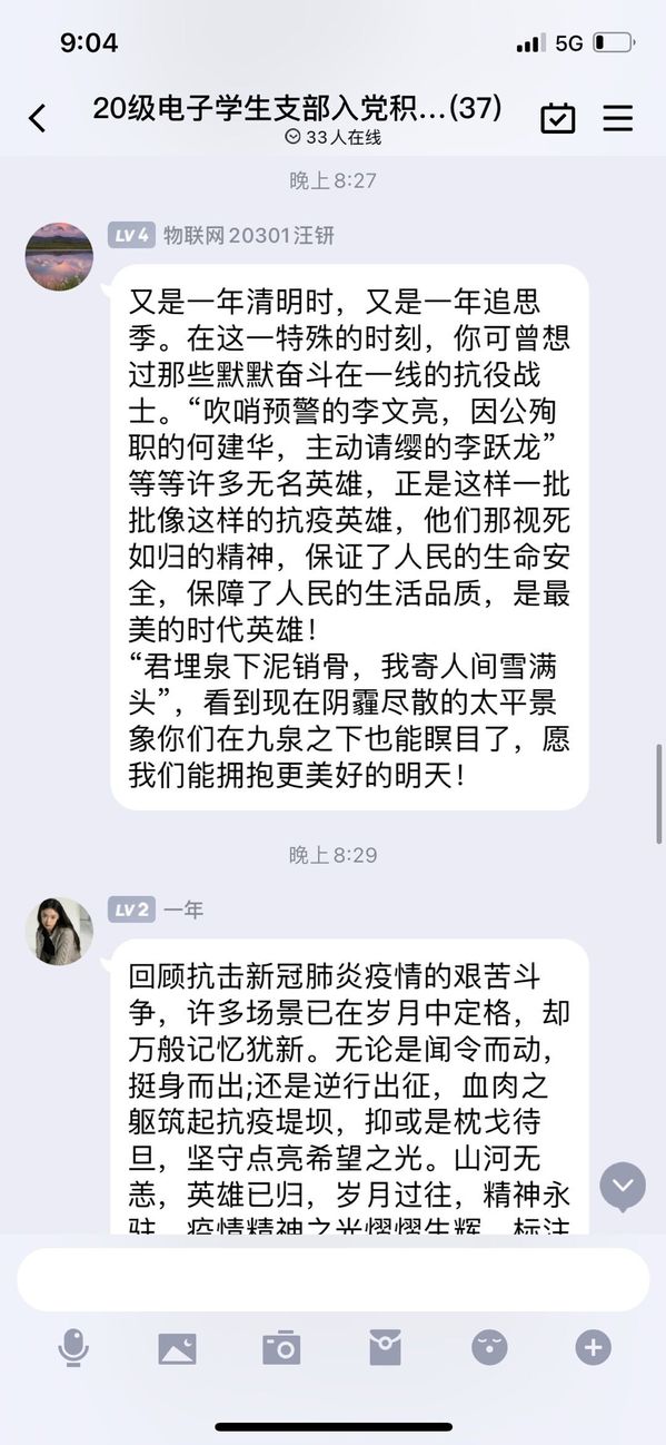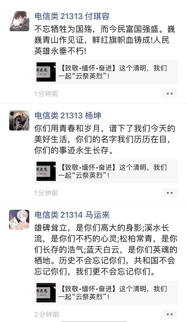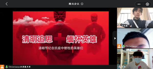 各班级以宿舍为单位,依托网络视频会议平台,以召开线上主题班会、讲述英烈故事、诵读清明诗文、撰写心得体会等形式,在线上向英烈祭扫致敬,弘扬英模精神!