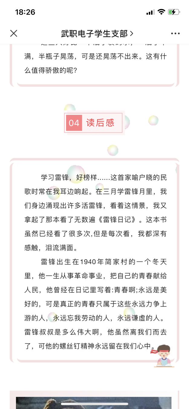 雷锋,是一个名字,更是一种精神。”为深入学习贯彻习近平总书记对深入开展学雷锋活动的重要指示精神,电子员工党支部下发了学雷锋活动的相关通知,提出各项具体任务,要求支部预备党员、入党积极分子努力成为新时代雷锋精神的传播者、弘扬者和践行者。