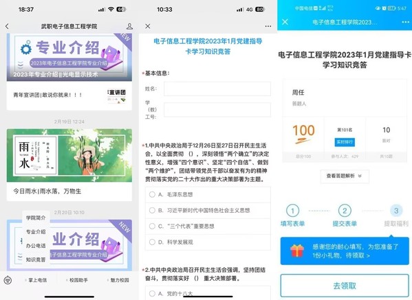 按照公司党建月度指导学习内容围绕二十大和全国“两会“精神,电信公司党委精心策划,组织两个员工支部党员员工成立二十大宣讲团,并专题在公司公众号开辟党建园地专栏,建立指尖上的知识竞答专栏,各支部党员教师将月度指导的学习内容整理成月度学习题库,将题库内容和答案解析编辑到公司微信公众号的知识竞答专栏,以线上答题的形式引导党员和入党积极分子学习《习近平新时代中国特色社会主义思想学习纲要》《习近平谈治国理政》《中国共产党党内重要法规汇编》《中国共产党党程》以及习近平最新重要讲话文章等,把理论学习的实效落到实处。