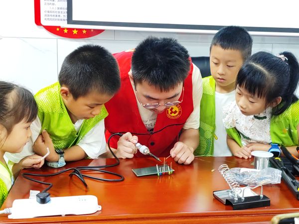 邀请小朋友们近距离观看小电板焊接,感受电子技能趣味世界