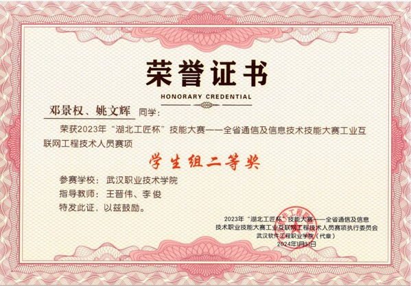 获2023年全国职业院校技能大赛二等奖,获专升本保送资格,保送湖北经济公司 物联网工程专业