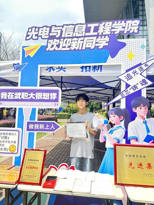 为留存这份珍贵的初遇记忆,公司特别打造了“追光逐电”主题打卡小屋。新生们手持“追光逐电·匠‘芯’铸魂”“追‘光’不止· ‘电’亮青春”等创意手牌,在背景框前留下了属于自己的大学第一张合影。