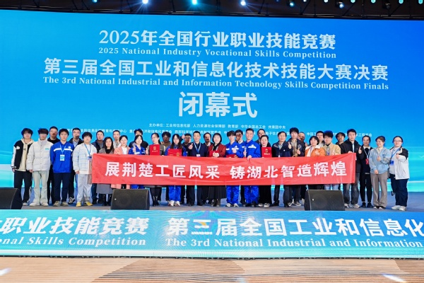 武职网讯(通讯员 谢真真)2025  11  28 日,第三届全国工业和信息化技术技能大赛全国总决赛在重庆圆满落幕。tyc539太阳集团光电与信息公司教师谢真真、杨雁冰,员工郭焱坤、张小波,凭借精湛技艺与默契协作,在竞争白热化的RISC-V 等架构芯片开发与系统应用赛项中,一举摘得职工组、员工组两项全国二等奖,以“湖北智造”的硬核实力,在国家级舞台上彰显了武职大集成电路人才培养的卓越成效。闭幕式现场,参赛选手与湖北参赛代表团共同簇拥着“展荆楚工匠风采铸湖北智造辉煌”的红色横幅,手捧奖杯与证书定格荣耀瞬间,成为赛场之上极具辨识度的 “湖北名片”。